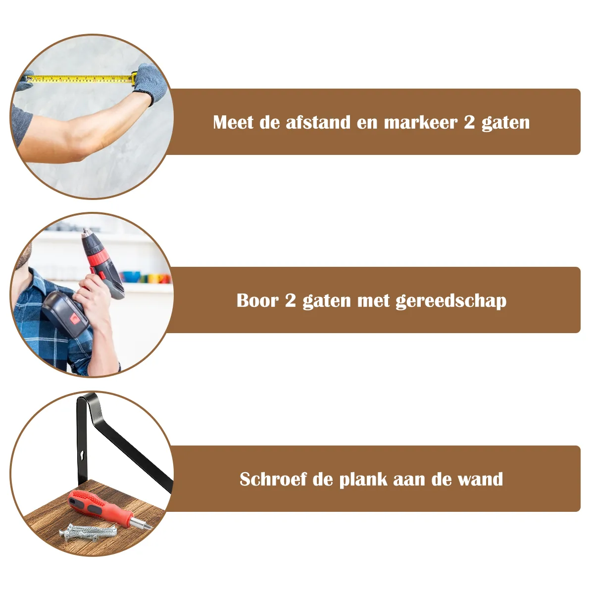 【Compact ontwerp voor ruimtebesparing】Door het ontwerp voor wandmontage neemt deze opbergrek geen vloeroppervlak in beslag in uw huis. Dit slimme ontwerp verhoogt de verticale ruimtebenutting aanzienlijk. Met het compacte formaat van 60cm x 15cm x 51cm kan deze plank op elke smalle plaats worden geplaatst.