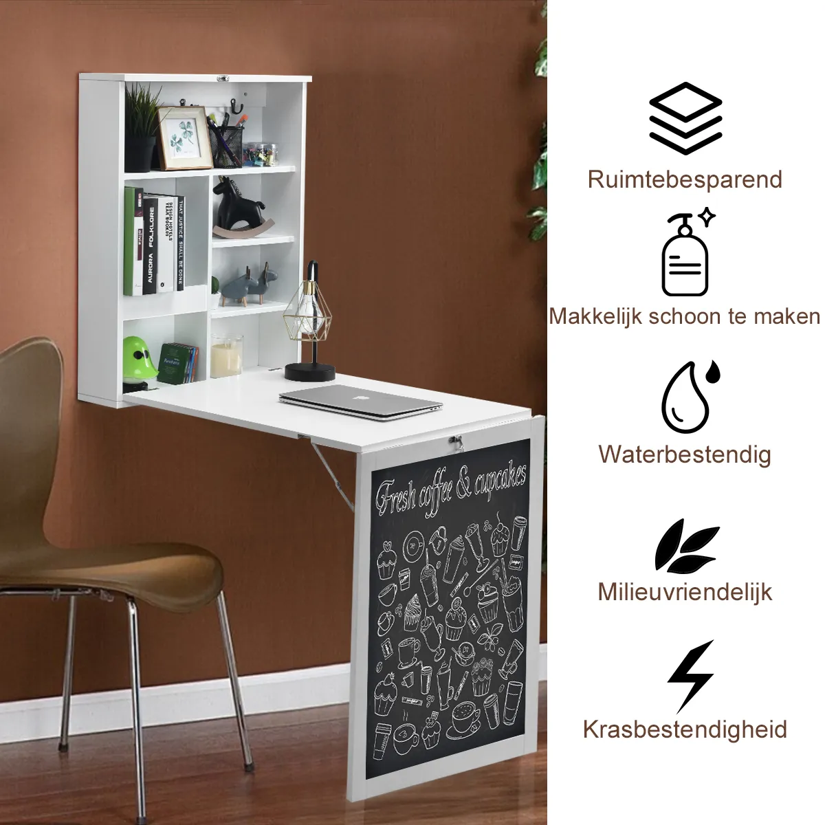 Ruimtebesparend en opvouwbaar ontwerp – Het aan de muur monteerbare en opvouwbare houten bureau biedt een ruimtebesparende oplossing voor diegenen die het comfort van een volledig functioneel bureau in een kleine ruimte niet willen opgeven. Met het ingebouwde krijtbord kunt u persoonlijke takenlijsten opnemen of notities achterlaten voor andere gezinsleden.