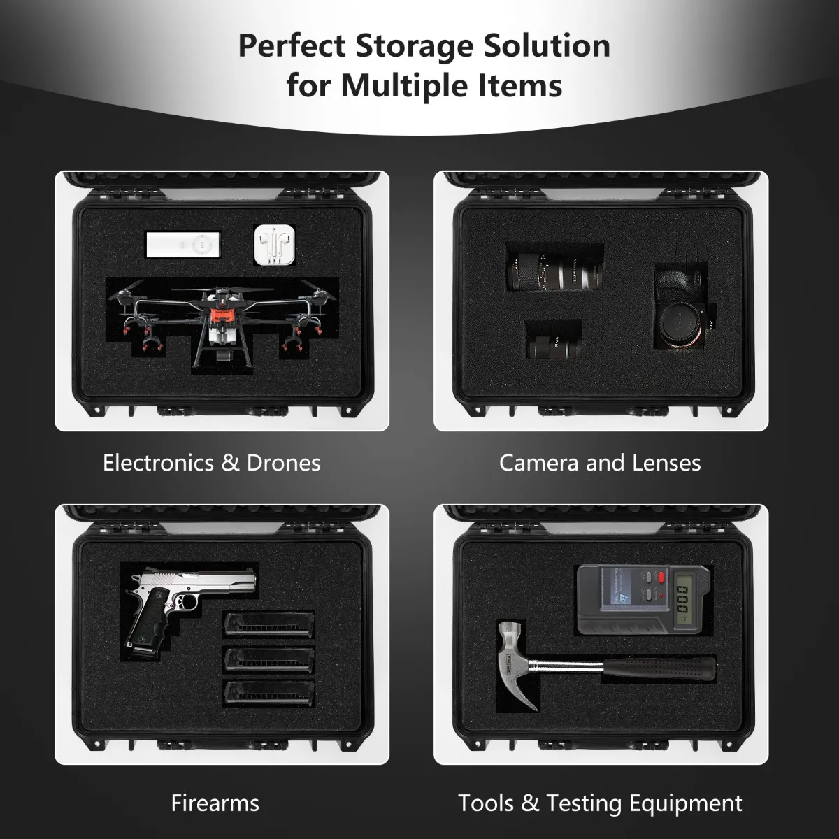 Aanpasbare binnenruimte: De waterdichte harde koffer heeft een inzetstuk van trek-en-snijschuim voor een perfecte pasvorm binnenin. Het schuim is verdeeld in kleine blokjes die je kunt knippen en verwijderen om de vorm aan te passen aan het item. Je hoeft je geen zorgen te maken dat het item in de koffer er gemakkelijk uit kan glijden.