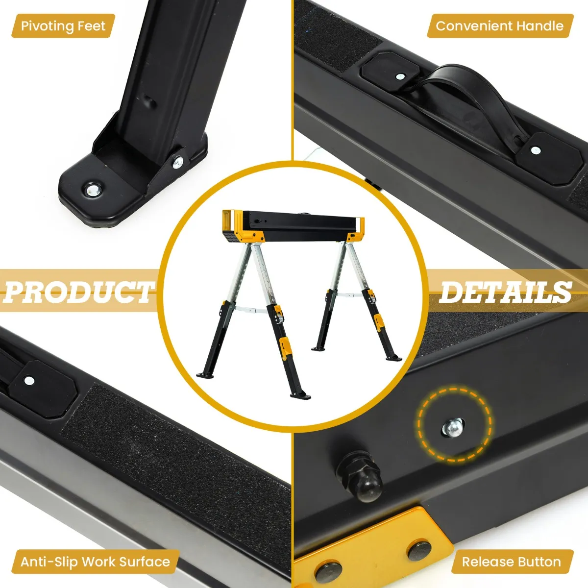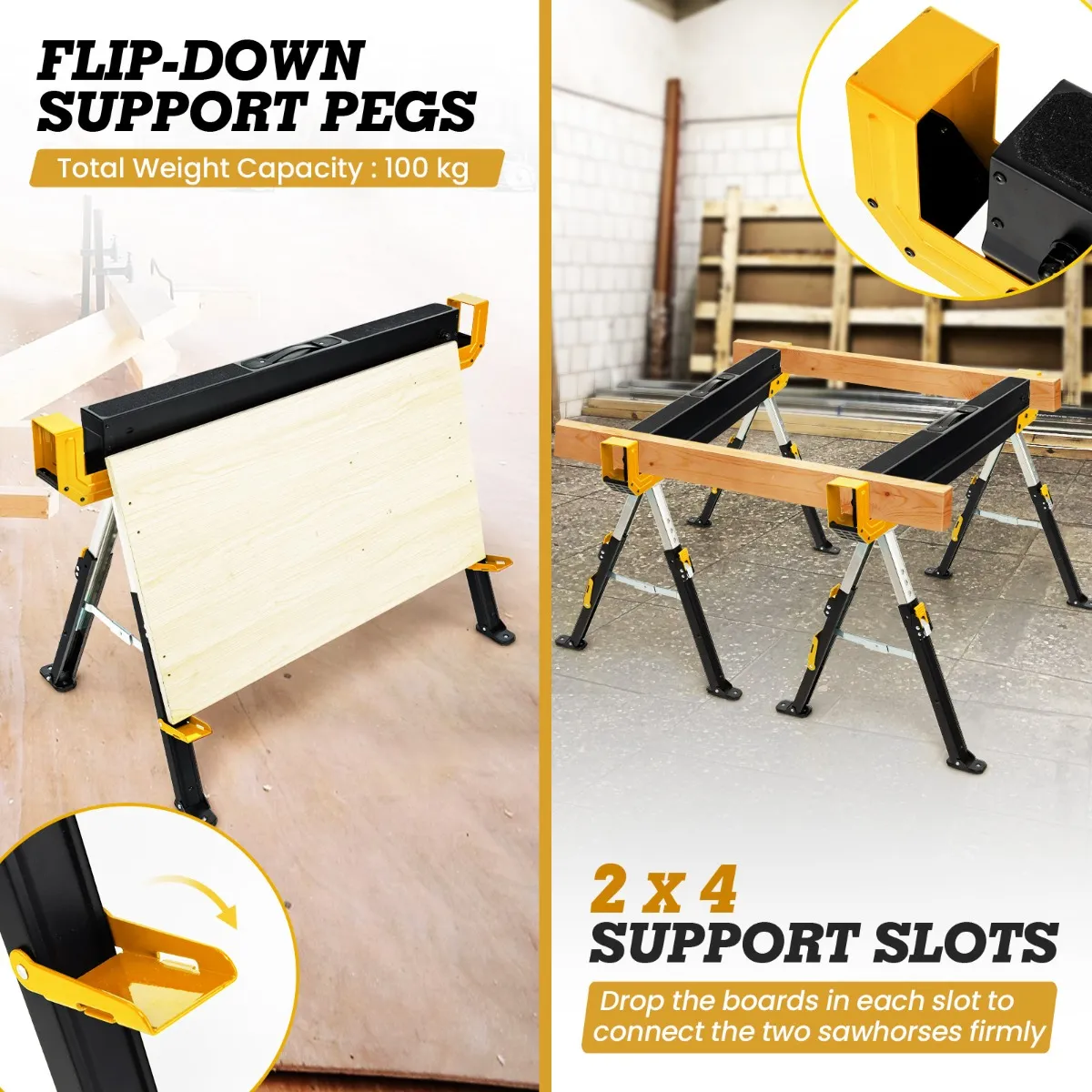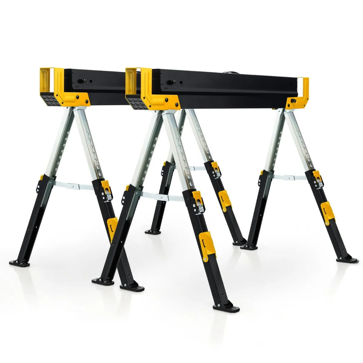 Met een robuust en roestvrij stalen frame zijn de zaagbladen vrij robuust en kunnen ze zwaar gewicht weerstaan. Bovendien verbeteren het antislipoppervlak en de voeten de algehele stabiliteit aanzienlijk. Elke zaagbok is uitgerust met twee 2 x 4 steunsleuven en twee steunpennen, die je veel comfort bieden. Het verstelbare ontwerp is een ander hoogtepunt. Je kunt de totale hoogte naar behoefte in 9 standen instellen en zo in de meest geschikte positie werken. Bovendien zijn de zaagbladen ook inklapbaar en uitgerust met praktische handgrepen, waardoor ze ruimtebesparend kunnen worden opgeborgen en moeiteloos kunnen worden vervoerd. Al met al, als je op zoek bent naar functionele zaagbladen voor houtbewerking, zijn deze 2 zaagblokken de perfecte optie.
