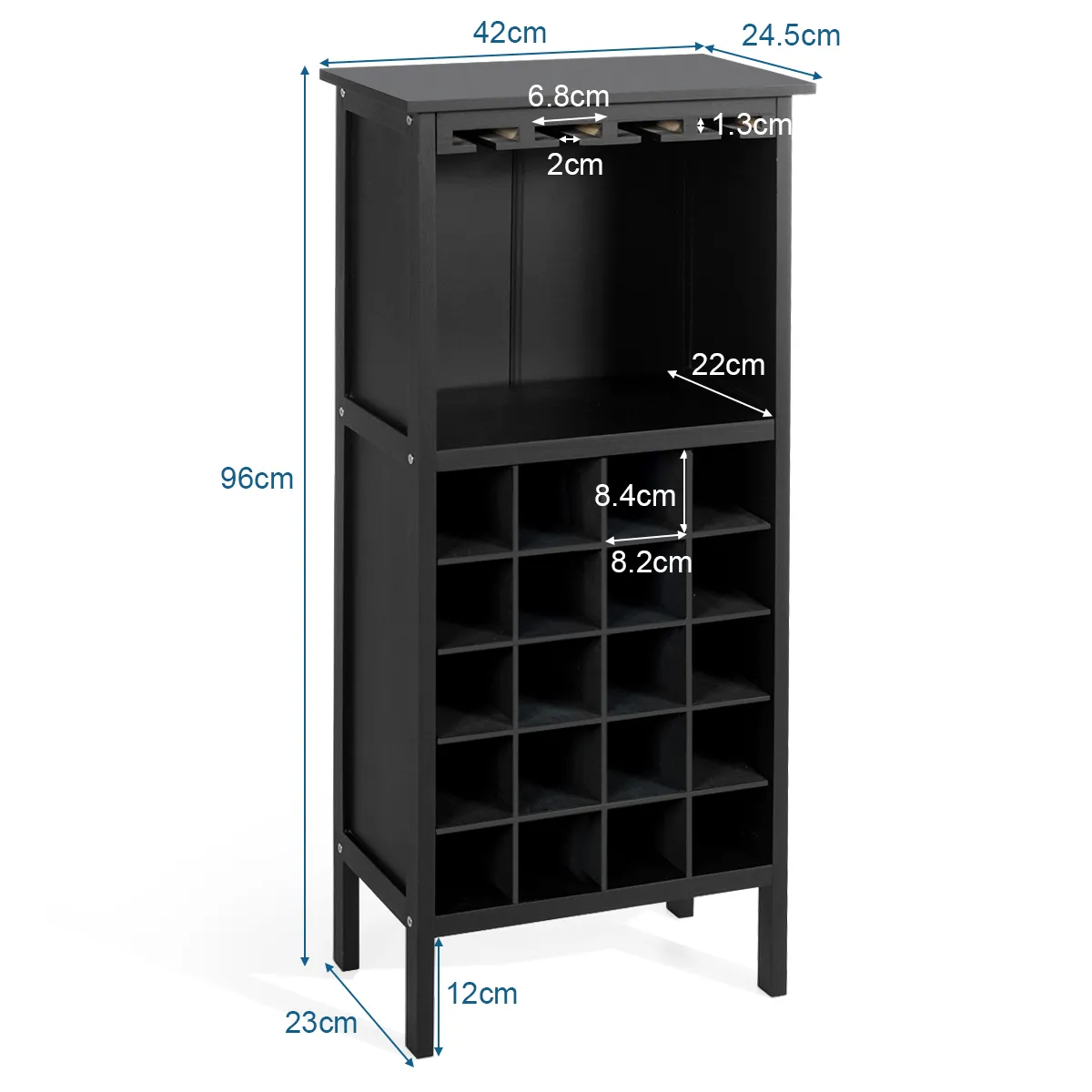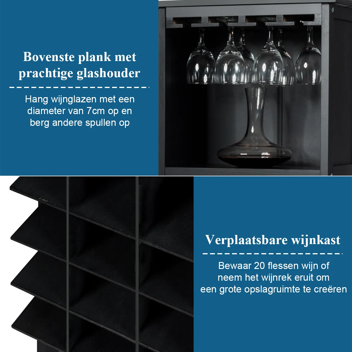 Onze wijnkast heeft een 5-laagse wijnrek en 4 rij glashouders, en u kunt 20 wijnflessen plaatsen, afhankelijk van het type en jaar. De bovenkast biedt voldoende ruimte om uw wijnen en flessen of andere voorwerpen op te bergen. Het stevige houten frame is zeer duurzaam voor een lange levensduur. Tegelijkertijd is de elegante uitstraling geschikt voor thuis, bars, restaurants, feestmalen, enz.