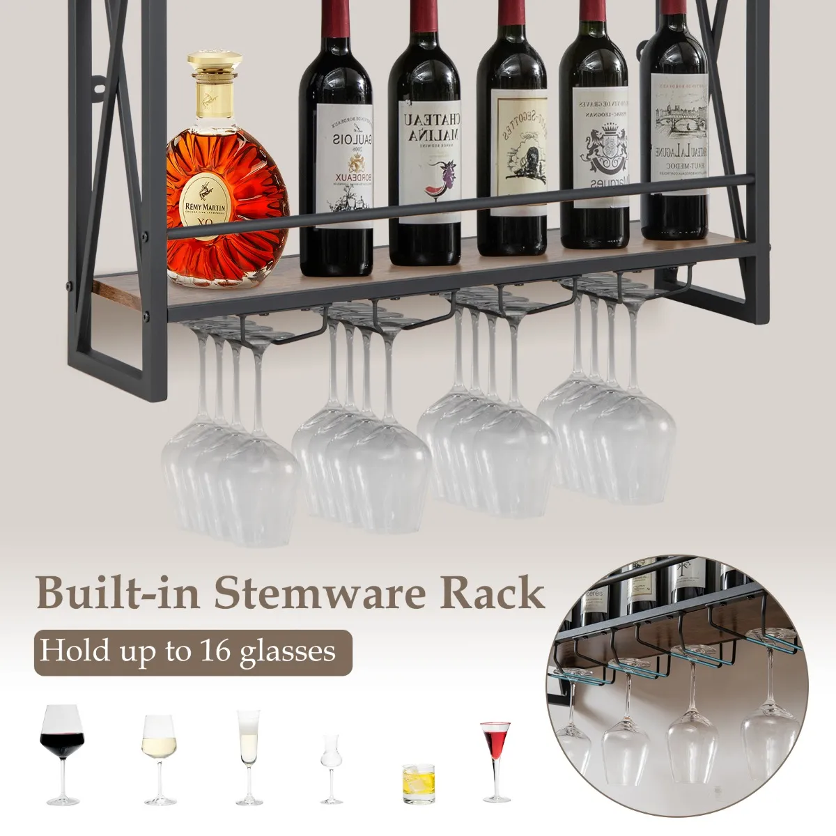 Veel opbergruimte: Dit aan de muur gemonteerde wijnrek bestaat uit 3 praktische legplanken voor verschillende voorwerpen, waaronder wijnflessen, potplanten, decoraties enz. Daarnaast biedt de geïntegreerde steelglashouder ruimte voor maximaal 16 glazen van verschillende hoogtes.