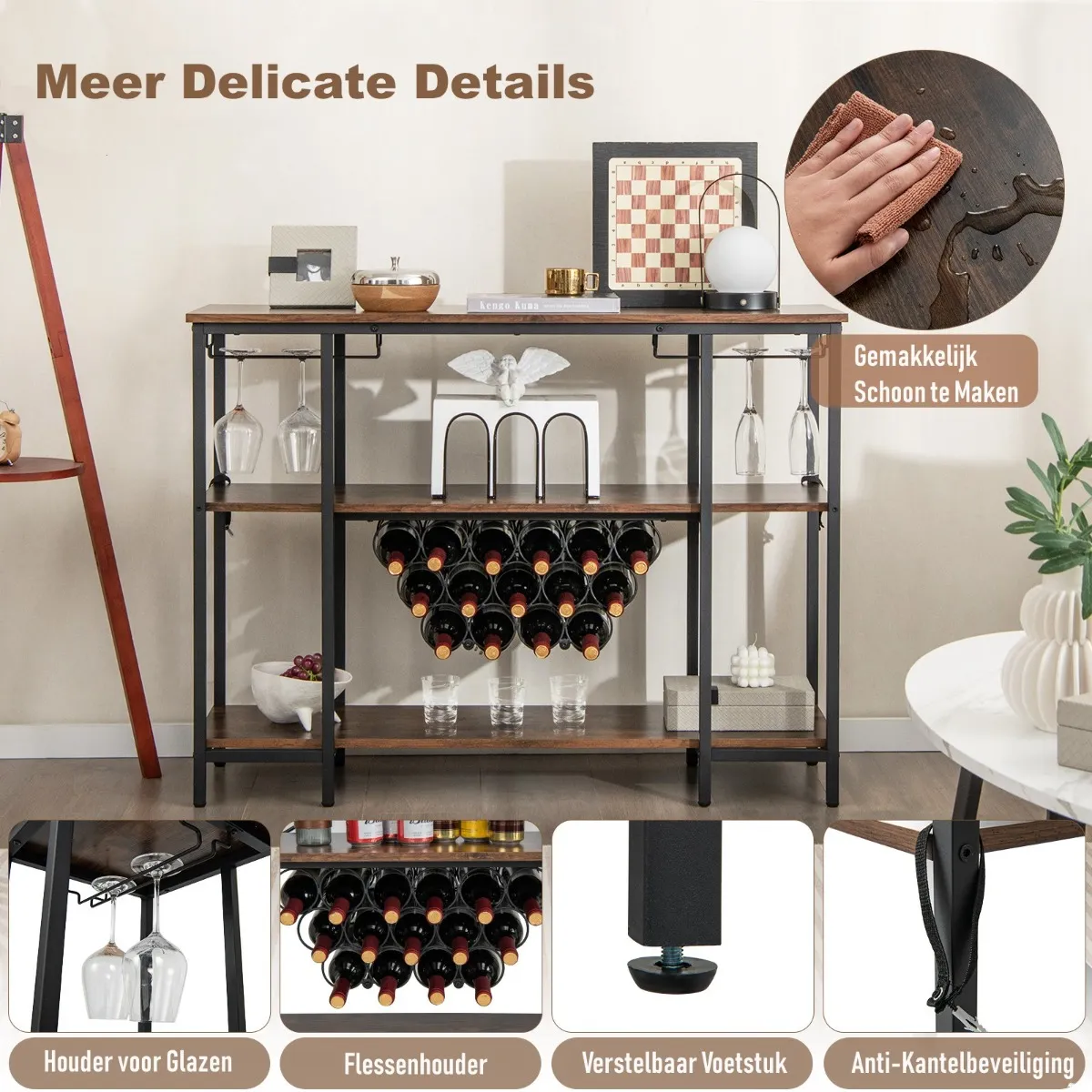 【Meer prachtige details】 De liefde voor detail onderscheidt dit wijnrek. Verstelbare voetkussens zorgen voor stabiliteit op elk oppervlak en voorkomen krassen op de vloer, terwijl het oppervlak met houtnerf een eenvoudige reiniging en duurzaamheid mogelijk maakt. Elk detail is zorgvuldig doordacht om je algehele ervaring te verbeteren.