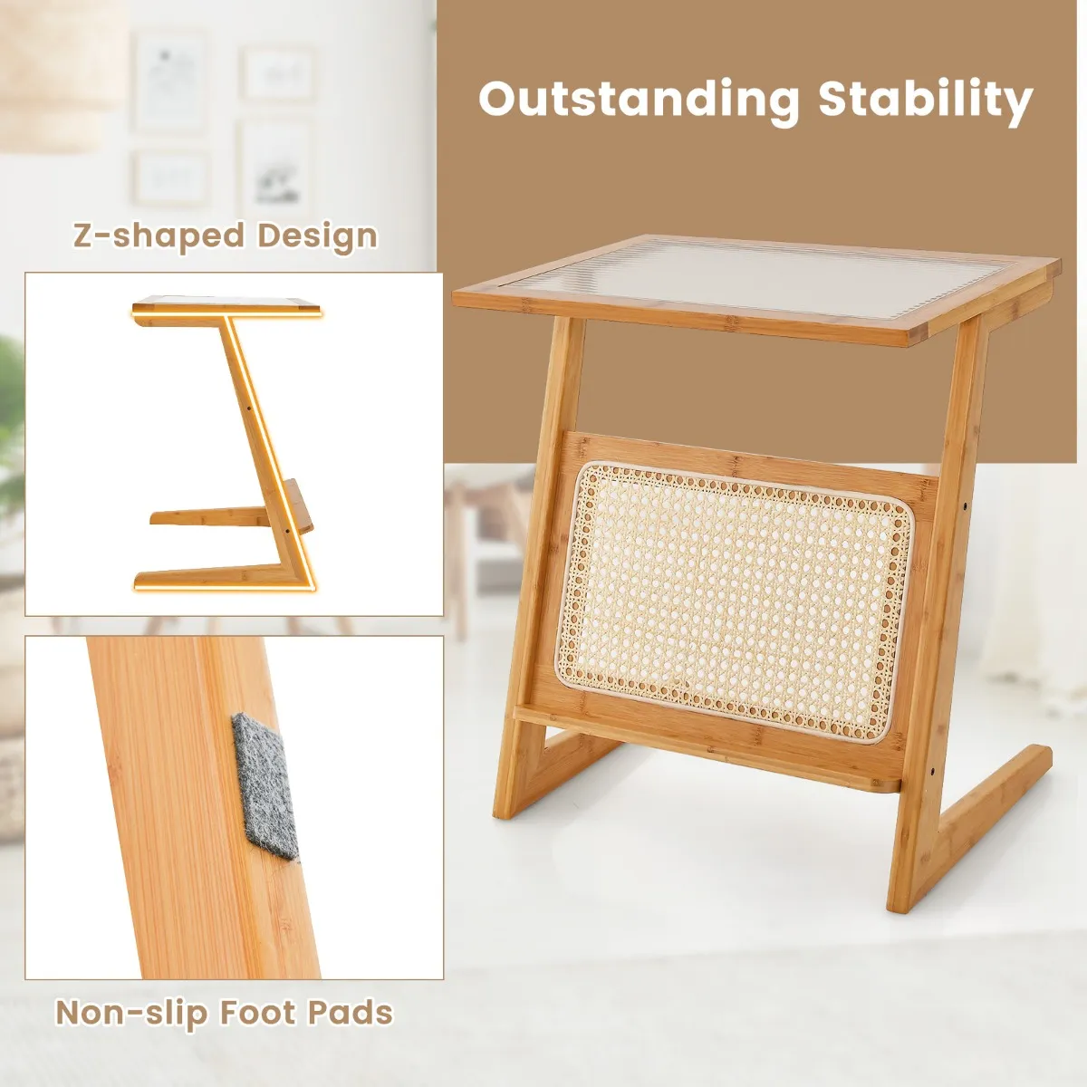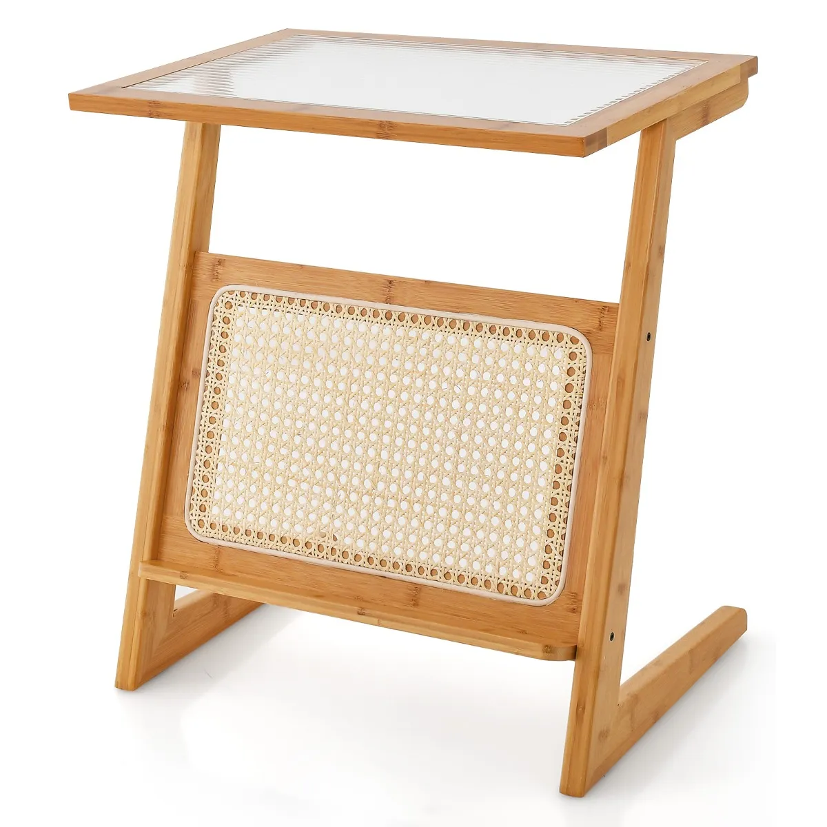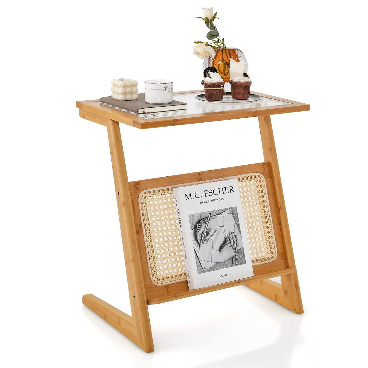 【Geniek Z-vormig ontwerp】Onze Z-vormige bijzettafel heeft een compact formaat waardoor je het onderste deel van de tafel onder je bank of bed kunt schuiven om ruimte te besparen. Bovendien heeft de voorkant van de Z-vormige bijzettafel een rotan plank om je tijdschriften bij de hand te houden.