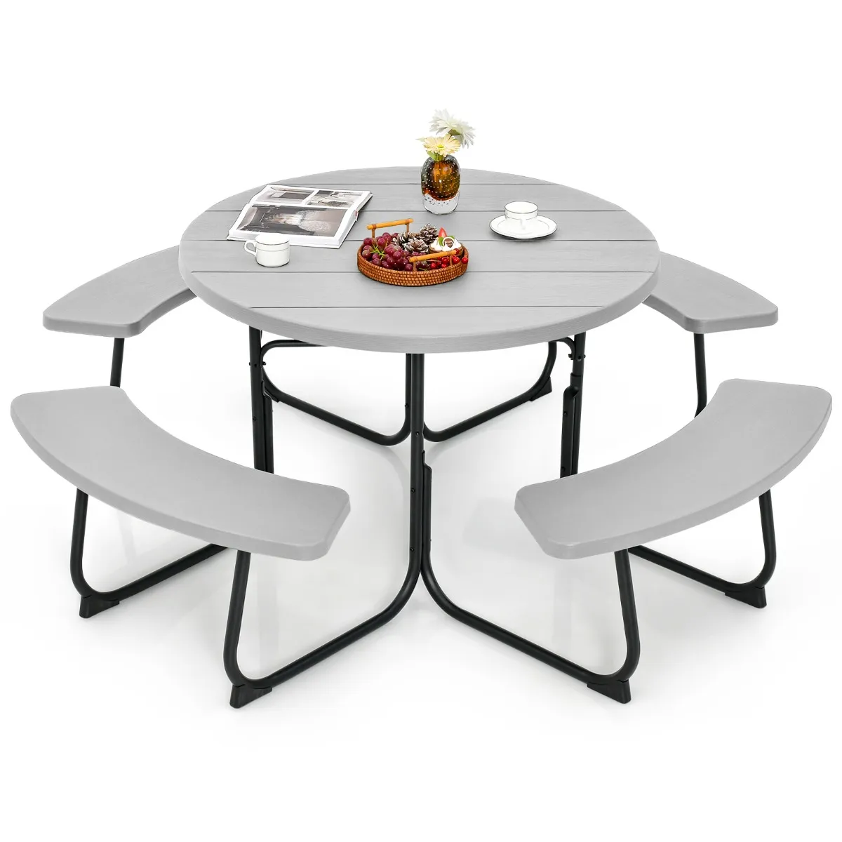 【Bijeenkomsten buiten】 De ronde tafel van 110 cm met gebogen zittingen biedt plaats aan maximaal 8 personen en garandeert een aangename eetervaring. Of je nu een barbecue organiseert of buiten eet, de picknicktafel is de perfecte plek voor familie en vrienden.