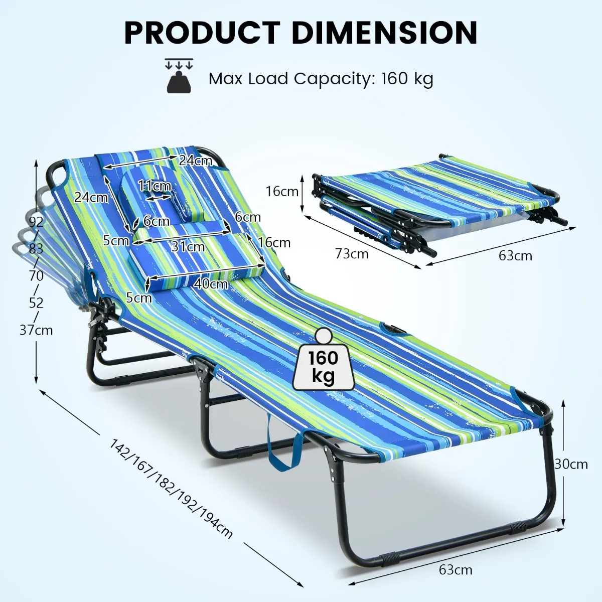 5-voudig verstelbare rugleuning: De strandstoel beschikt over een verstelbare rugleuning, die met een eenvoudig vergrendelingssysteem eenvoudig en stabiel in 5 standen kan worden vastgezet. Zo kun je naar behoefte een ideale hoek kiezen om te lezen, achterover te leunen om te chatten of direct plat te liggen om een rustig dutje te doen.