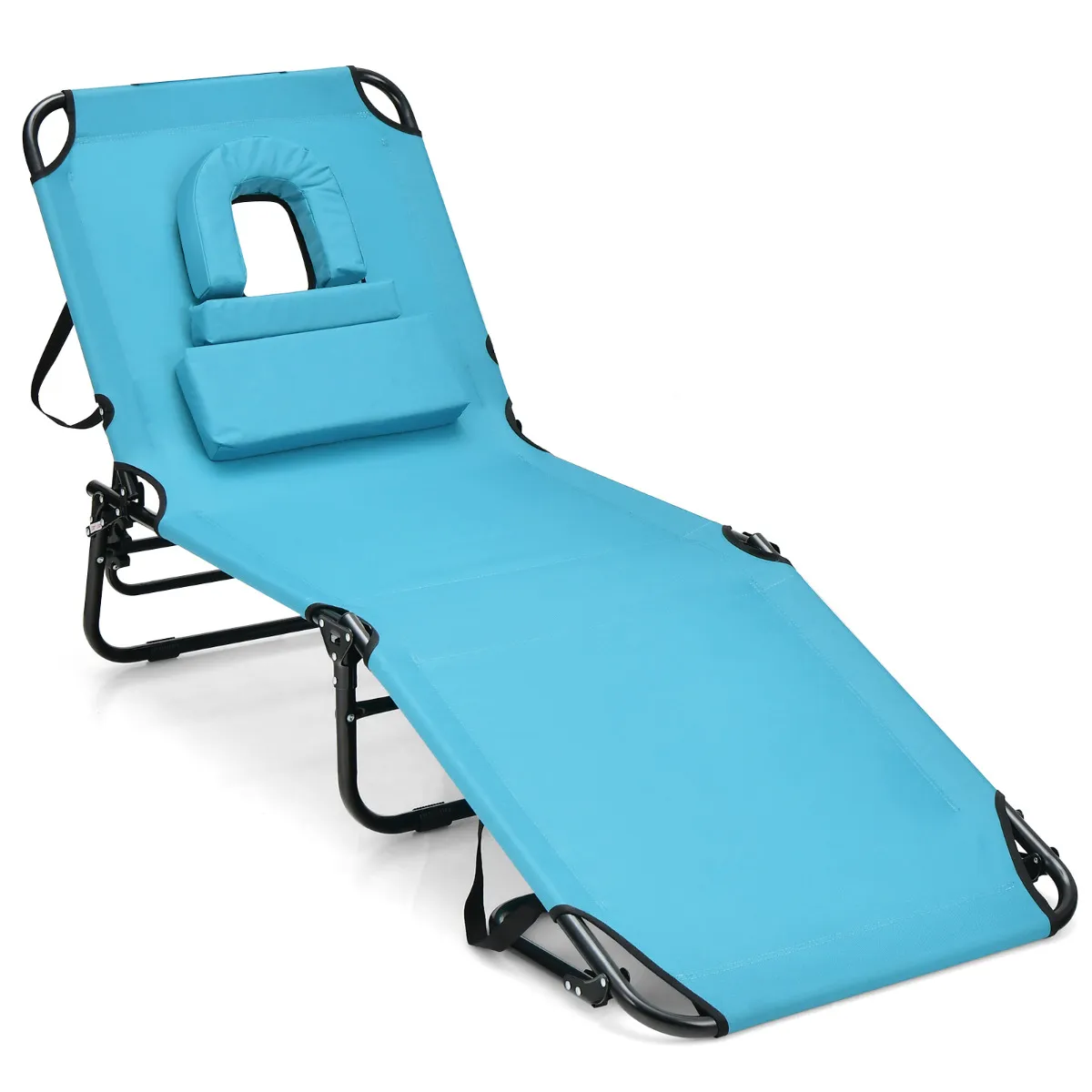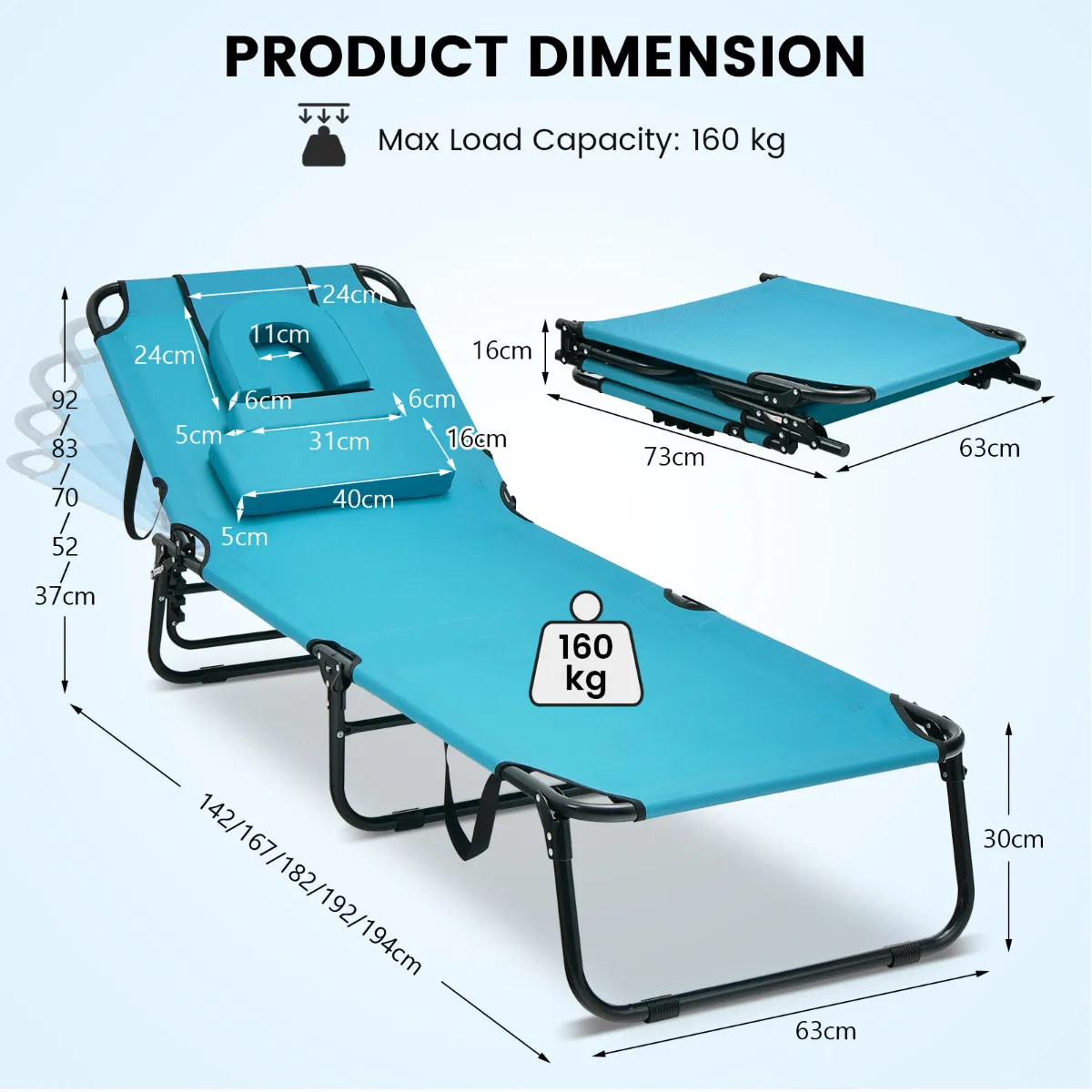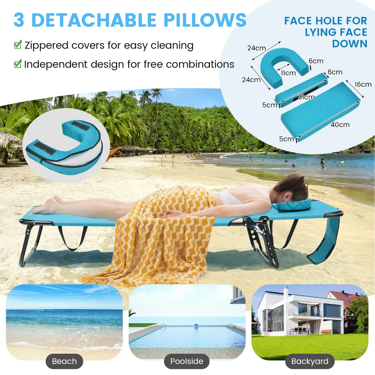 Afneembare kussens en gezichtsopening: De zonnestoel bevat een gezichtsopening, een afneembaar afdekdoek en 3 afneembare kussens met ritssluiting om je te inspireren op verschillende gebruiksmethoden. In de rugligging kunnen verschillende kussens worden gecombineerd om je de meest comfortabele positie te bieden.