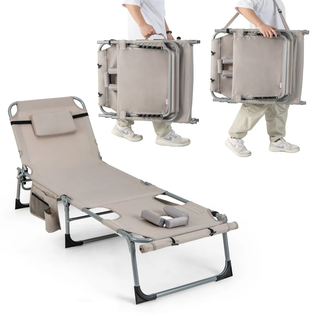 De achterkant van deze verstelbare ligstoel heeft vijf posities en het voeteneinde heeft twee posities om volledig aan je verschillende zitbehoeften te voldoen, zodat je comfortabel kunt lezen, slapen of telefoneren. Bovendien biedt een afneembare hoofdsteun comfortabele ondersteuning voor je nek. Als je naar beneden wilt liggen, kun je ook je hoofd in het gezichtsgat leggen en je armen door de sleuven aan elke kant steken om comfortabel te lezen. Bovendien kan deze strandstoel voor eenvoudig opbergen worden ingeklapt als hij niet in gebruik is. Of je kunt hem overal mee naartoe nemen, zoals naar het strand, het zwembad of het terras.