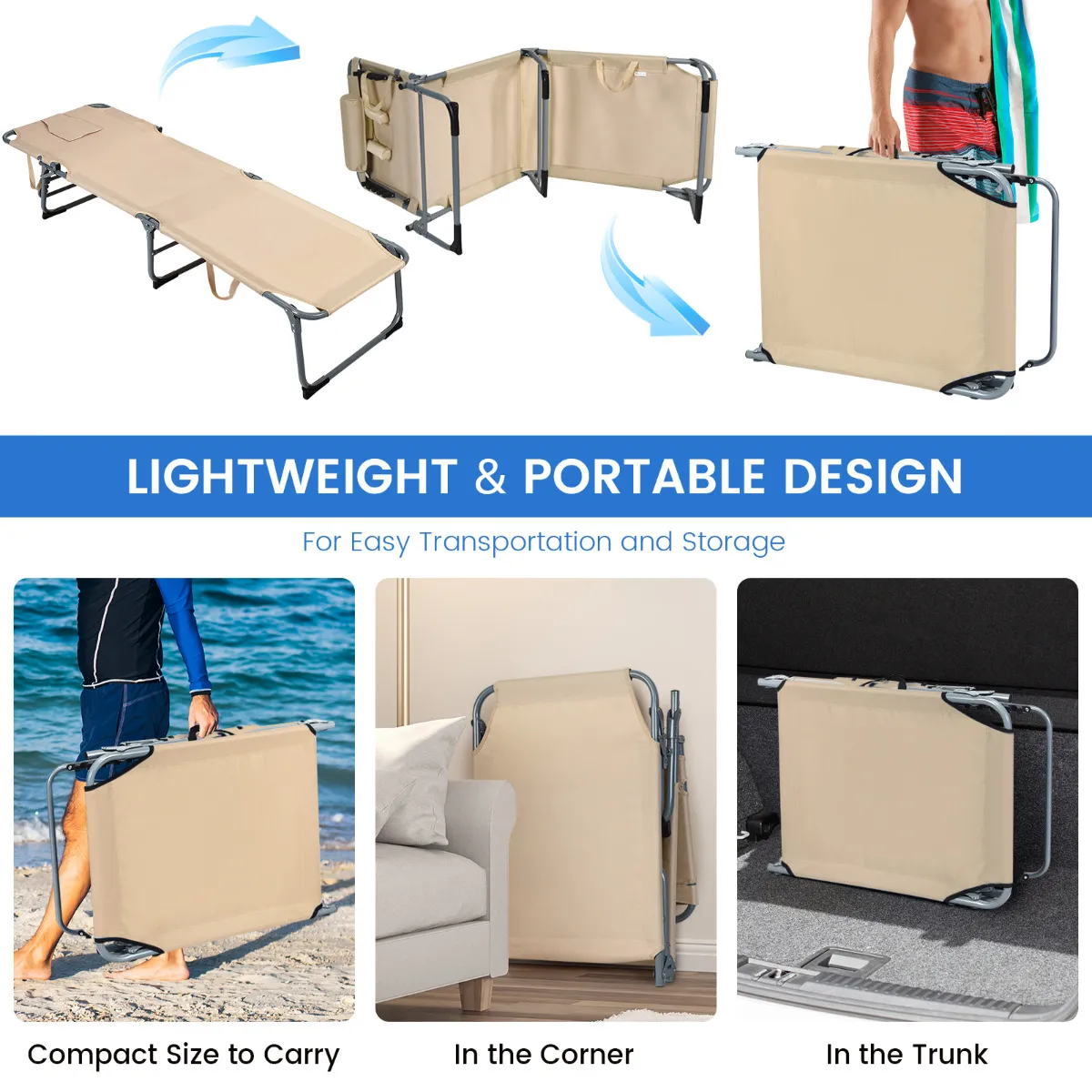 5 instelbare posities passen zich aan je verschillende activiteiten aan, terwijl de open holte ruimte biedt voor je gezicht als je op de buik ligt. De kussens zijn pluizig, verstelbaar en afneembaar. Het eenvoudige transport wordt toegeschreven aan het lage gewicht en de inklapfunctie van deze ligstoel om te zonnebaden. Je kunt hem gebruiken op je terras, stranduitstapjes, campingavonturen en andere outdoor- en indooractiviteiten.