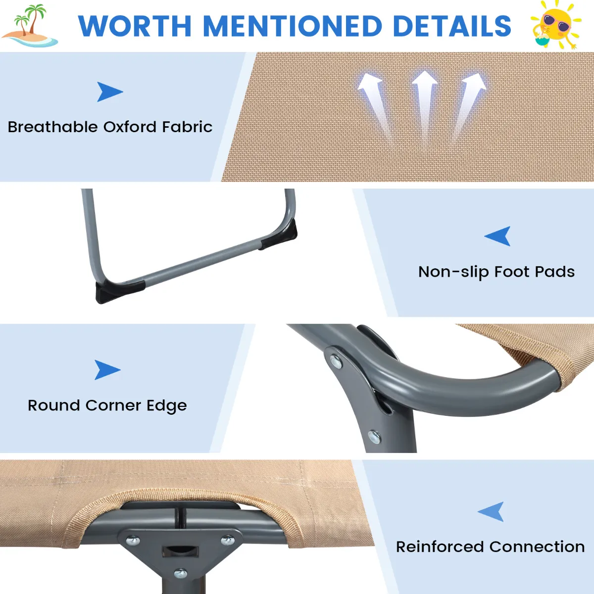 Holle ruimte voor het gezicht en bijpassende kussen: De kussen bestaan uit spons met hoge dichtheid, die je hoofd comfortabel kan houden. Je kunt de positie van het kussen aanpassen en het verwijderen als je wilt. En er is een ingebouwde afsluitbare holte voor je gezicht, zodat je tijdschriften kunt bekijken terwijl je je rug bruint.