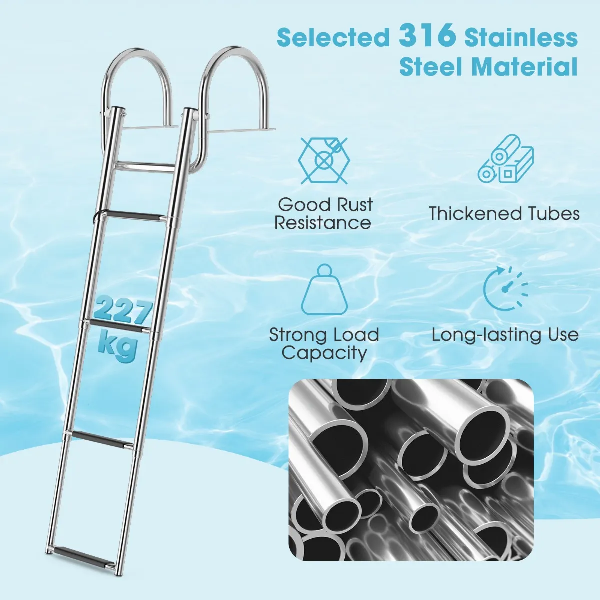 Hoogwaardig roestvrij staal: Deze 4-traps pontonbootladder bestaat uit geselecteerd roestvrij staal, dat een goede roestbestendigheid en stabiliteit biedt voor langdurig gebruik. Bovendien zorgen verdikte buizen en vaste verbindingen voor een sterk draagvermogen van maximaal 227 kg.